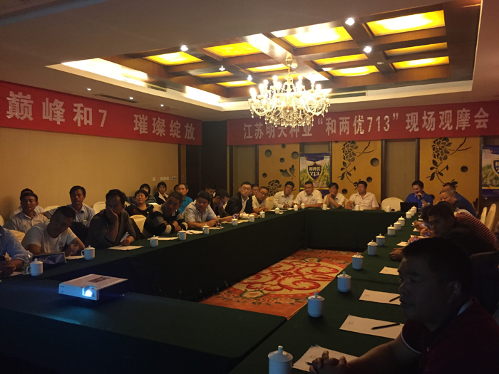 田間觀摩結(jié)束后,在宿遷江山大酒店會議室召開了現(xiàn)場會議,會議由雜交水稻部楊海波經(jīng)理主持,江蘇片區(qū)經(jīng)理喬昌寶首先向大家介紹了和兩優(yōu)713的品種特點(diǎn)、品種優(yōu)勢及配套的高產(chǎn)栽培技術(shù),隨后宿遷市寶豐種業(yè)張?zhí)密娊?jīng)理就和兩優(yōu)713在宿遷市的優(yōu)異表現(xiàn)進(jìn)行分享,并對和兩優(yōu)713的品種特點(diǎn)及市場推廣前景發(fā)表了看法。最后雜交水稻部楊海波經(jīng)理對公司雜交水稻的品種選育方向和品種布局做了詳細(xì)介紹。